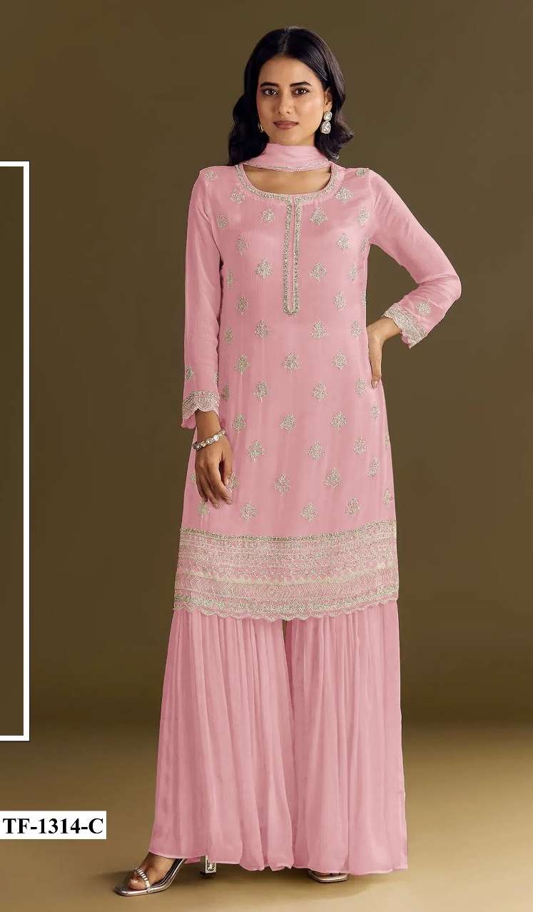 | Short Description | : | DESIGNER WEDDING PARTY WEAR CHINON SHARARA PALLAZO SALWAR SUIT HT 1314 COLOR |