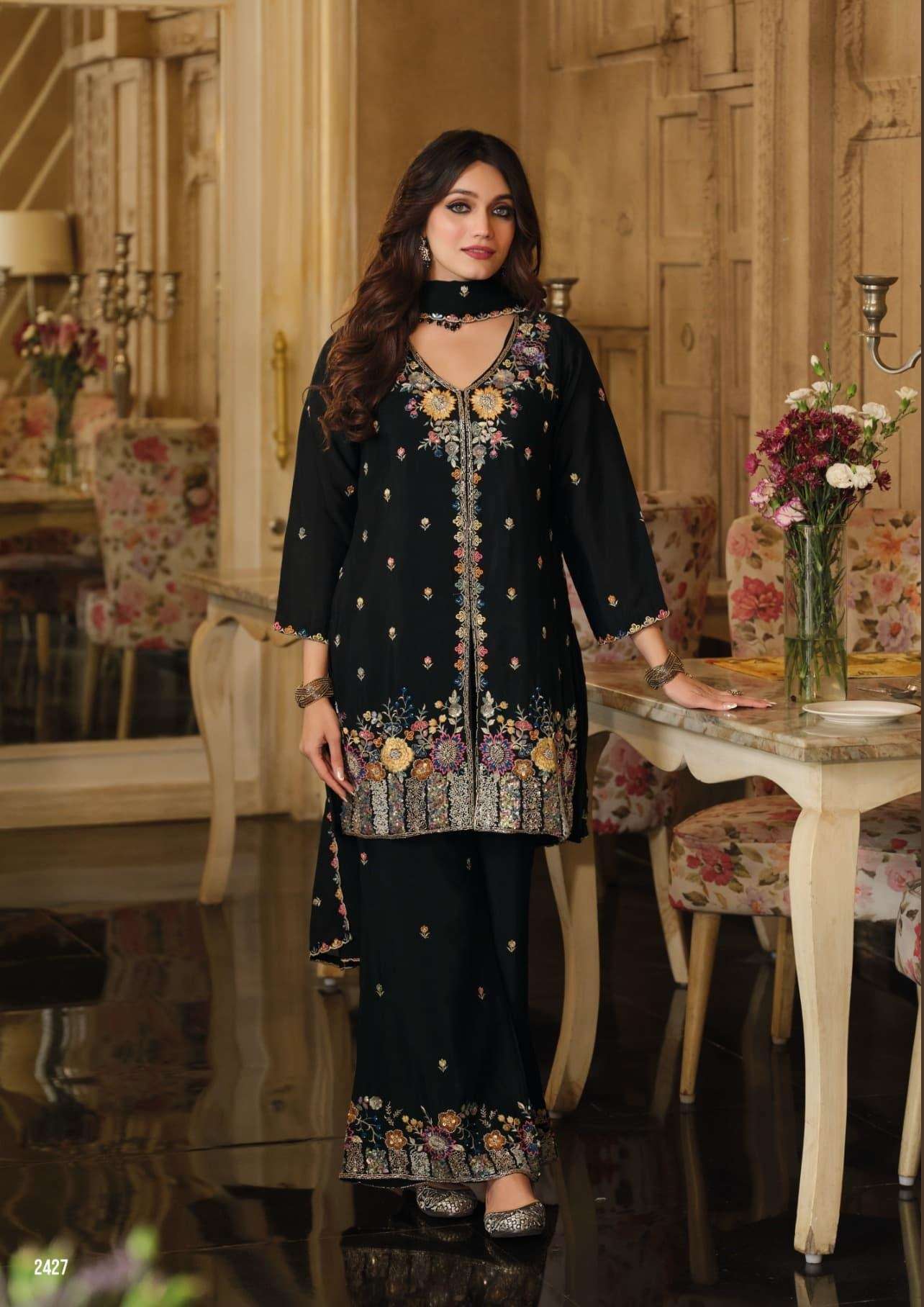 | Short Description | : | DESIGNER WEDDING PARTY WEAR CHINON SILK READYMADE SHARARA PALLAZO SALWAR SUIT EB SANVI 2426-2427 |