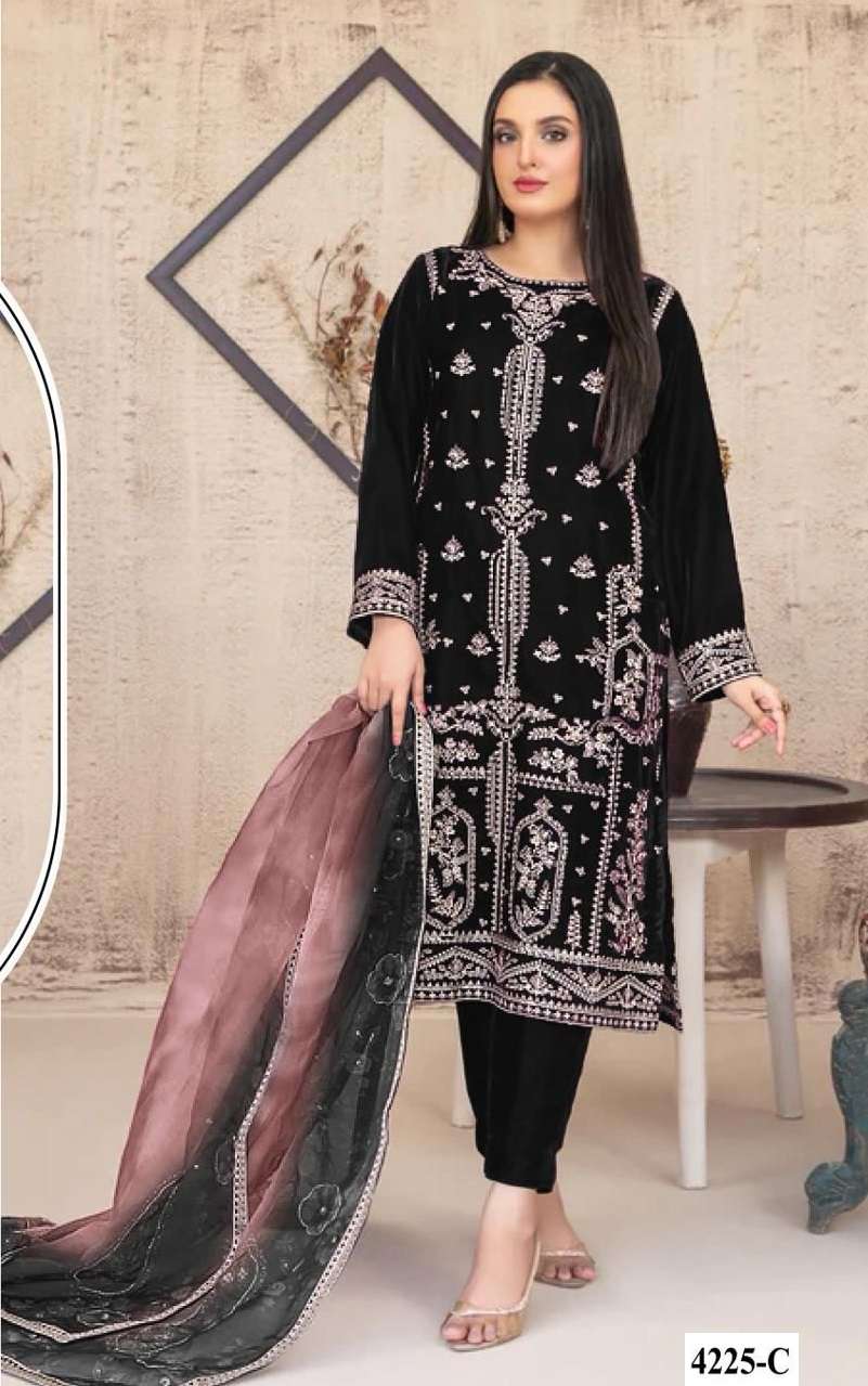 | Full Description | : | FABRIC:TOP:- VELVET, BOTTOM:-VELVET, DUPATTA:-ORGANZA SILK, EMBROIDERY AND SEQUENCE WORK |